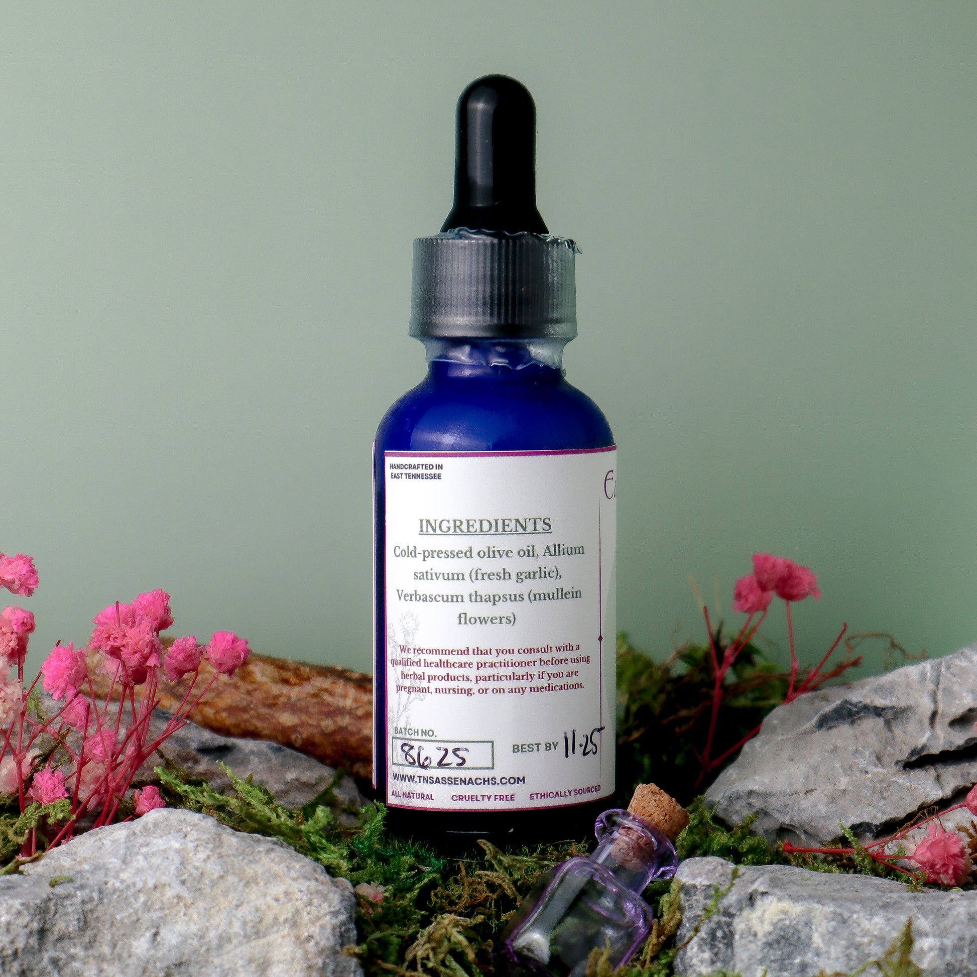 INGREDIENTS: Cold-pressed olive oil, Allium sativum (fresh garlic), Verbascum thapsus (mullein flowers)